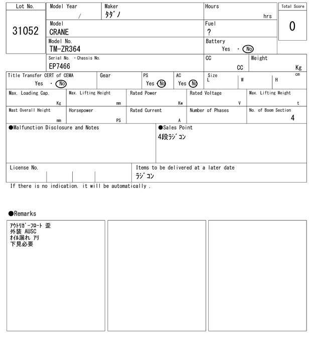 | タダノ.4ダンクレーン | TM-ZR364 | EP7466 | 0Hrs |