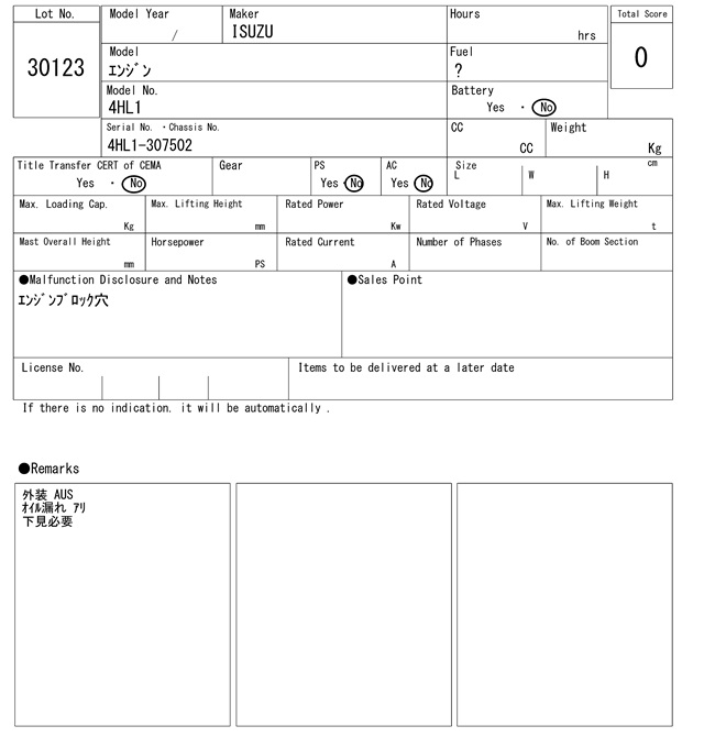 イスズ 4HL1 4HL1-307502 0Hrs