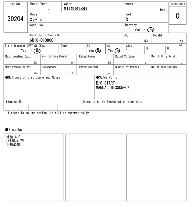 | ミツビシ | 6R10-010800 | 0Hrs |