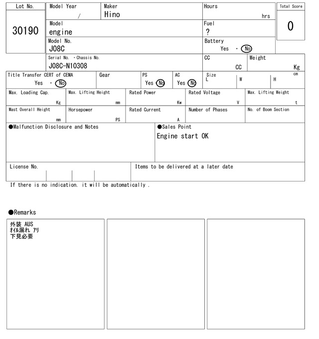 | ヒノ | J08C | J08C-N10308 | 0Hrs |