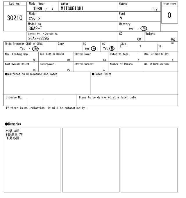 ミツビシ S6A2-T S6A2-22295 1989 0Hrs