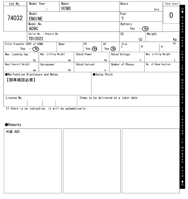 | ヒノ | A09C | TD12022 | 0Hrs |