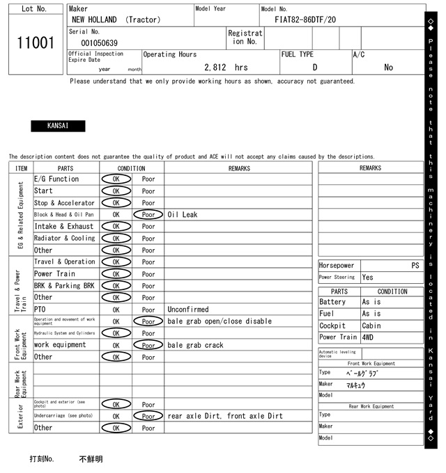 | ニューホランド | FIAT82-86DTF/20 | 001050639 | 2812Hrs |