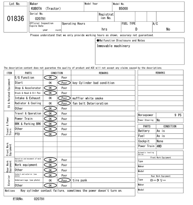 | クボタ | B5000 | 020791 | 0Hrs |