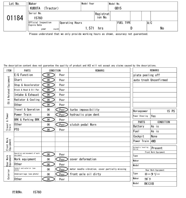 | クボタ | GB15 | 15760 | 1571Hrs |
