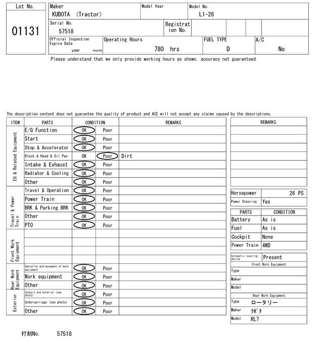 | クボタ | L1-26 | 57518 | 780Hrs |