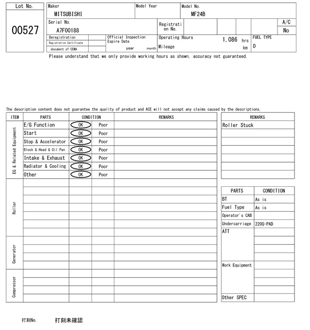 | MITSUBISHI | MF24B | A7F00188 | 1086Hrs |