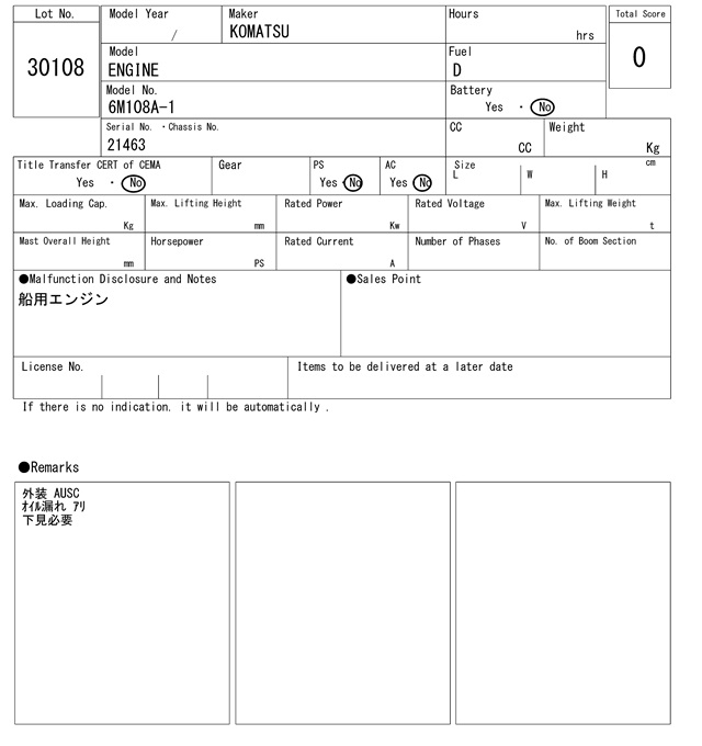 | コマツ | 6M108A-1 | 21463 | 0Hrs |