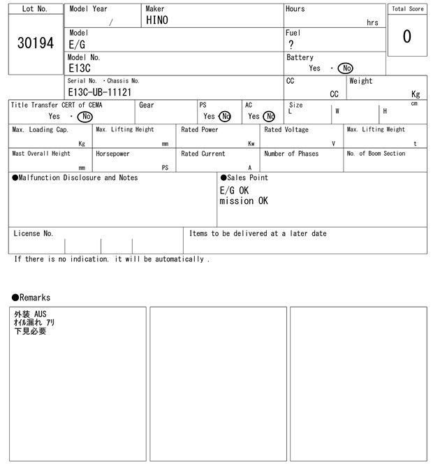 ヒノ | E13C | E13C-UB-11121 | 0Hrs |
