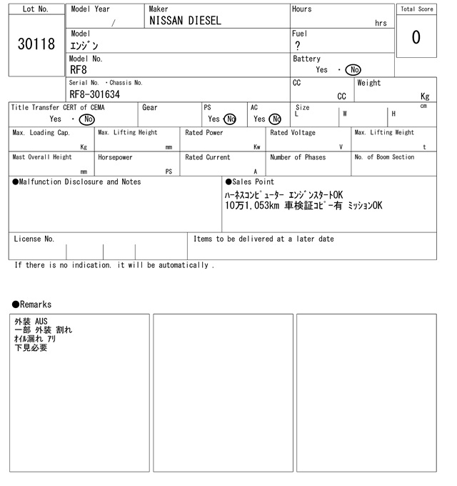 | ニッサン | RF8 | RF8-301634 | 0Hrs |