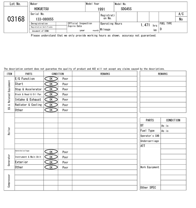 | HOKUETSU | SDG45S | 133-080055 | 1991 | 1471Hrs |