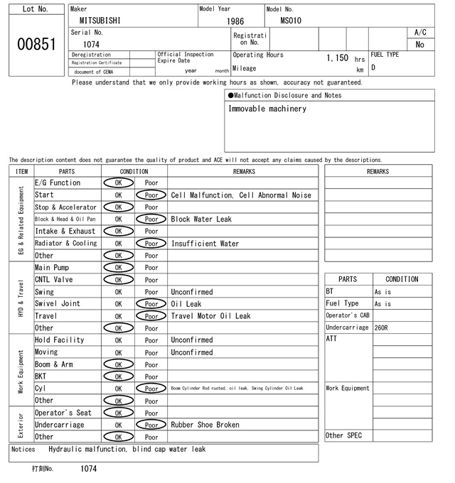 | MITSUBISHI | MS010 | 1074 | 1986 | 1150Hrs |
