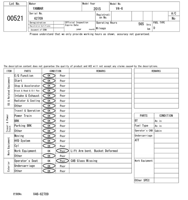 | YANMAR | V4-6 | 62709 | 2015 | 565Hrs | Cabin |