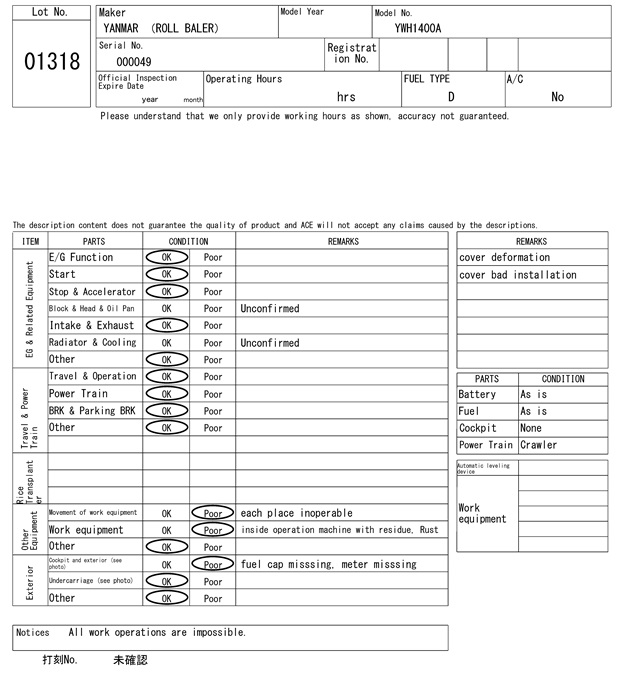 | ヤンマー | YWH1400A | 000049 | 0Hrs |