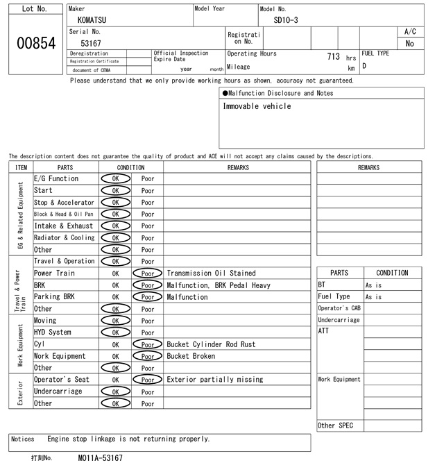 | KOMATSU | SD10-3 | 53167 | 713Hrs |