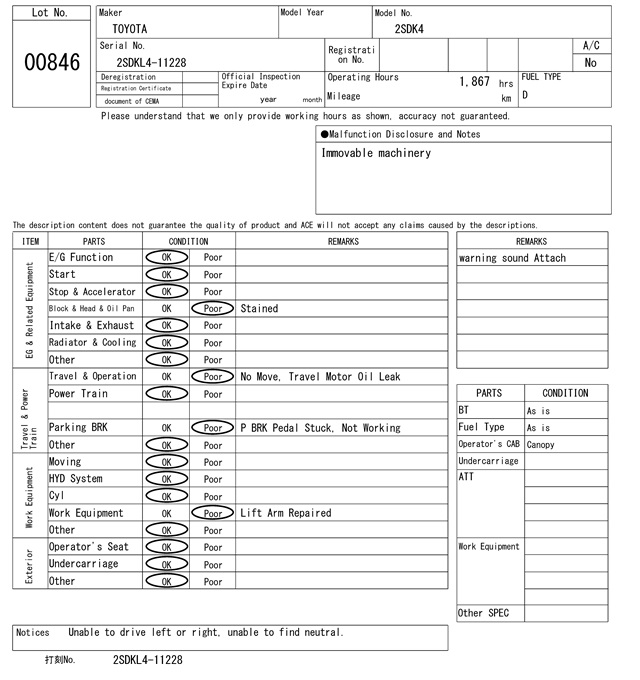 | TOYOTA | 2SDK4 | 2SDKL4-11228 | 1867Hrs | Canopy |